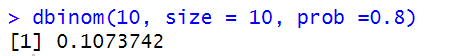 We can use R’s built in dbinom() function, which can calculate density, distribution function, quantile function, and random generation for the binomial distribution with parameters size and prob.This is conventionally interpreted as the number of ‘successes’ in size trials. In this case, a ‘success’ is a surgery with no complications, which occurs 80% of the time. The sample size is 10 patients, and we are testing to find the probability of success on all 10 patients.