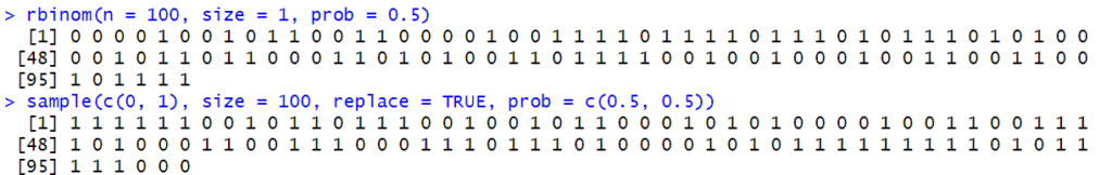 Simulated coin tossing: is probability better done using function called rbinom than using function called sample?
