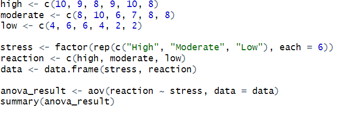 1. In R, we can analyze this data using a one-way ANOVA (analysis of variance.) We will start by bringing our data into RStudio. Then creating a data frame composed of values stress and reaction