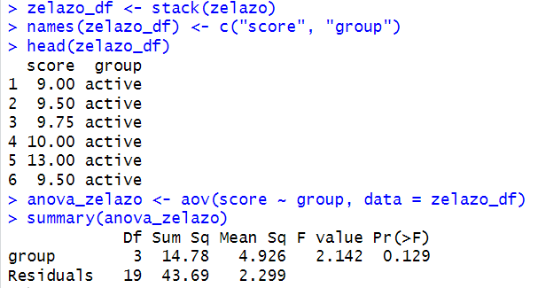 Using these values and data frame, we can conduct use R’s built in function, aov, to analyze and return a summary.