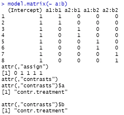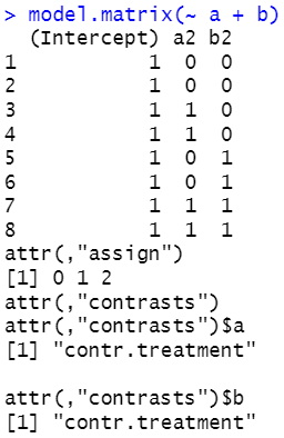 The model including only the interaction (a:b) sometimes produced singularity warnings, which occur when there isn’t enough data to estimate all coefficients. With 8 observations and 4 interaction levels, some combinations lack sufficient information, making the model “rank-deficient.” In contrast, the main-effects-only model (a+b) fit without any issues because it has fewer coefficients relative to the number of observations. The model with both main effects and interaction (a*b) fits successfully but demonstrates that adding interaction terms increases model complexity.