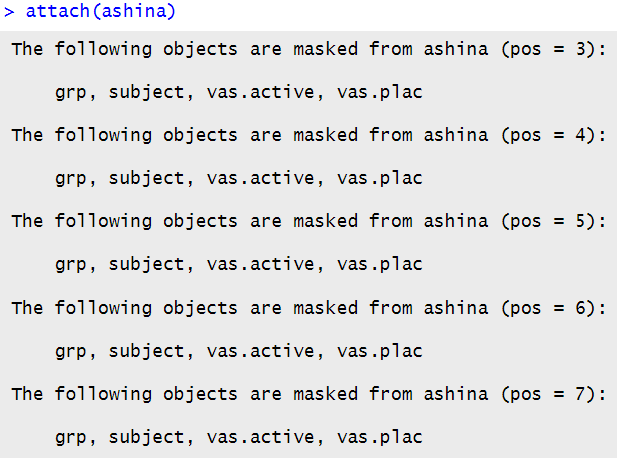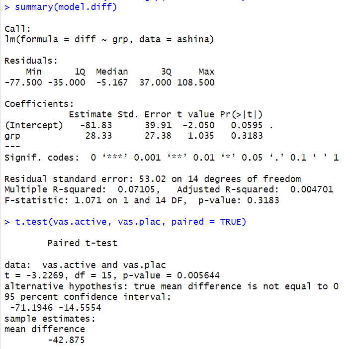 Comparing the additive model results for the Ashina data with the paired t-tests shows that both methods lead to similar conclusions, but the additive model gives more detail. The t-tests compare the active treatment (vas.active) and placebo (vas.plac) directly, showing whether there is a significant difference between them. The additive model, however, also accounts for differences between subjects and periods, which helps explain variability in the data. Some differences that look significant in the t-test may be adjusted in the additive model when considering these other factors. This means the additive model gives a more complete view of what is affecting the results, while the t-test provides a simpler comparison. Overall, both methods show that the treatment has an effect, but the additive model explains more about why the differences occur.