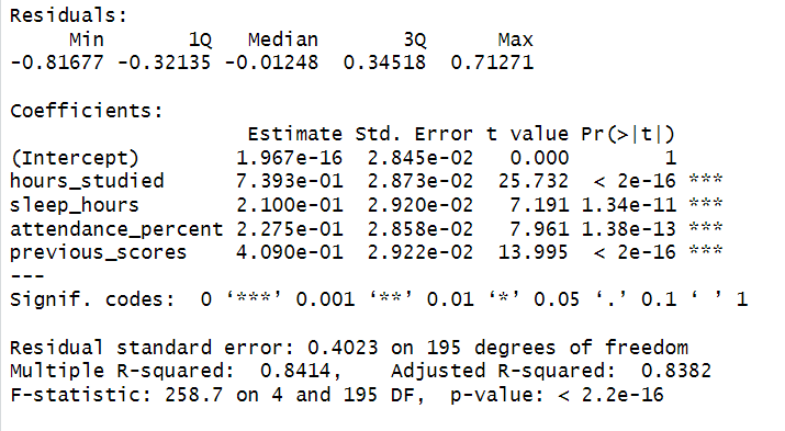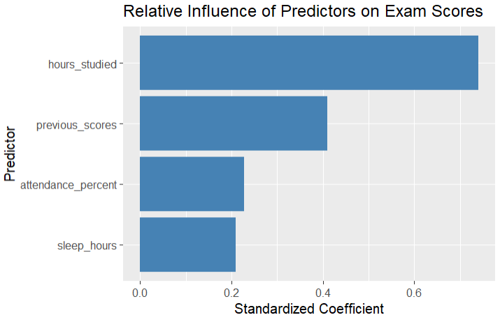 The results show that hours studied has the strongest impact on performance, followed by previous scores, attendance percentage, and sleep hours. Although all predictors are statistically significant, the visualizations and standardized coefficients indicate that study habits and prior performance are far more influential than sleep or attendance. This suggests that while sleep and attendance matter, focusing on study hours and building on prior knowledge has the biggest effect on exam outcomes.